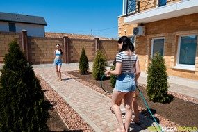 DownloadThree girlfriends, Dakota Doll, Sumiko, and Virgin Butterfly, spend the summer day together. They need to water the plants, but their playful natures ruin everything. They hose each other with water outdoors till they are wet through and then go indoors to wipe one another with fluffy towels. They get so excited in the process that they undress one another and caress their hot, sexy bodies with their talented hands and hot tongues. Naughty trio licks, fingers, and toys the wet pussies of one another till they all get their threesome satisfaction.